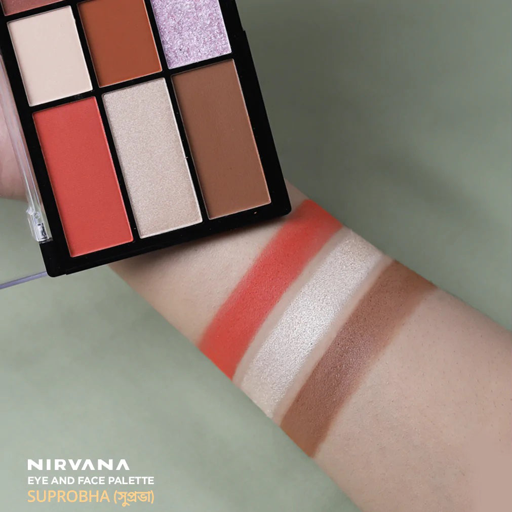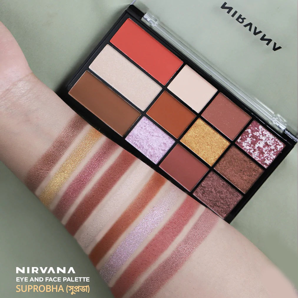 The Nirvana Color Divine Eye and Face Palette features pigmented shades with matte, shimmery, and glittery finishes, plus blush, highlighter, and contour. Its blendable formula and versatile color selection make it perfect for all makeup enthusiasts.