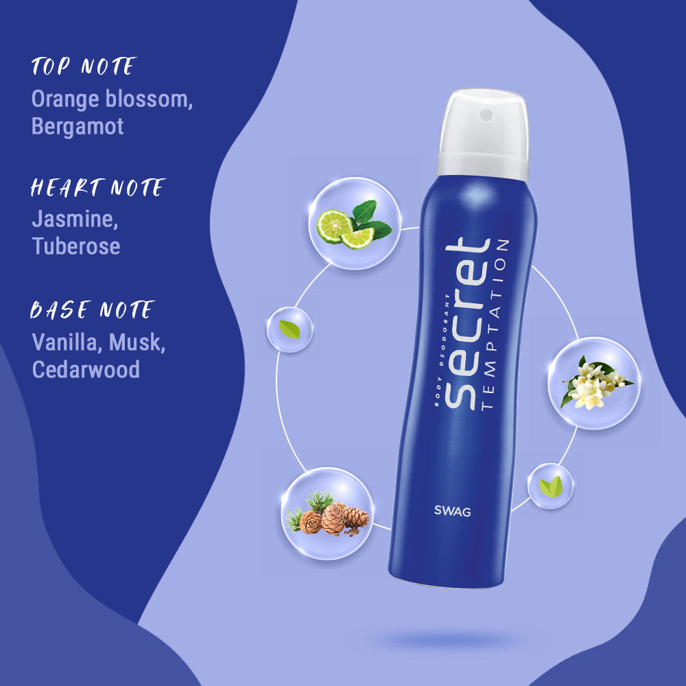 A bewitching fragrance that blows up your confidence and uplifts your mood instantly. Meet Swag Deodorant by Secret Temptation! Crafted exclusively for the contemporary woman who exudes charisma and style, Swag Deo is a powerhouse of alluring scents that will keep you feeling vibrant throughout the day.